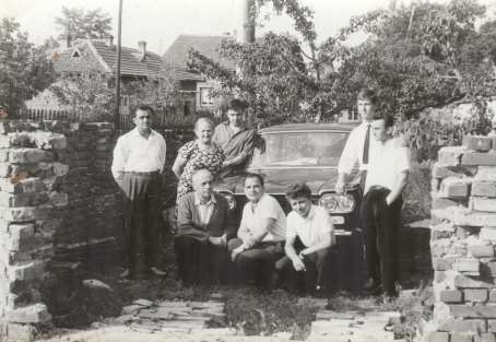 Тази снимка ни изпратиха в Алжир, за да видим новата кола. Вижда се, че са разрушили част от оградата за да я вкарат в двора. Отляво надясно – бате Цецо, баба Йонка, до нея чичо Гошо, пред нея – клекнал – дядо Петко. Другите не познавам.