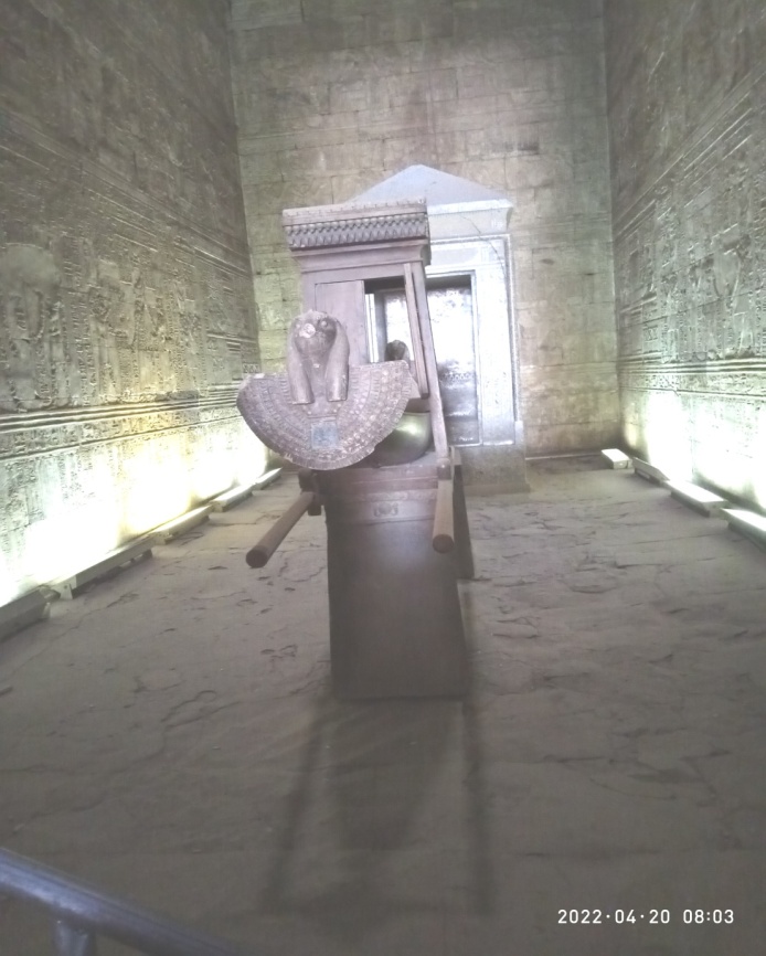 Накрая стигаме до светилището то е слабо осветеното, благодарение на две дупки в покрива. Светилището е запазило каменен пиедестал, посветен на Птолемей III и съпругата му Беренис, на който някога е била поставена лодката на богинята.Помещението е много голямо, с изцяло изписани стени.