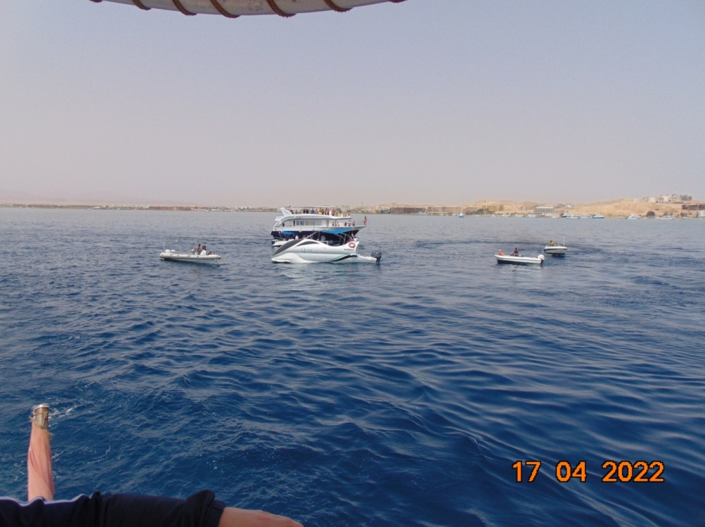 Към 9.30 тръгваме. Пред Хургада, на около 10км са разположени няколко ниски и съвършено голи острови, които го отделят от Червено море и трафикът на кораби там, такива не виждаме, за това пък малките корабчета и лодки обаче са десетки. Карат без никакви правила и се разминават на сантиметри. Даже нашият кораб леко обра боята на един друг. По пътя се кефиме, особено когато се появяват и четири делфина. След около 40 минути доктигаме остров Jiftun и намиращия се там Orange bay. Правят ни инструктаж, обясняват ни какво ще правим през деня. Първото посещение е на плажа на въпросния залив, където ще може да прекараме два часа.