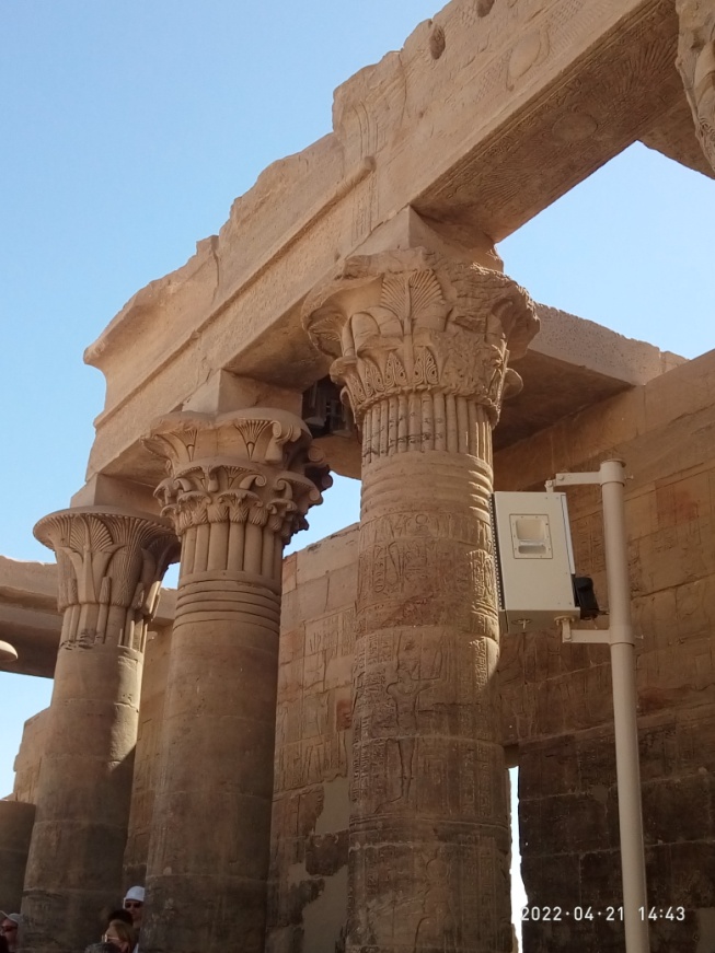 Почти от пристана попадаме на широка площадка с колонада от двете страни. Вече се ориентираме,че храмът е от епохата на Птоломеите. Те са гръцка династия основана от един от диадохите на Александър Велики. Сграта не е толкова гигантска, по-елегантна е, колоните с по-богато орнаментирани капитали. Сградите не са толкова тежки и тромави.