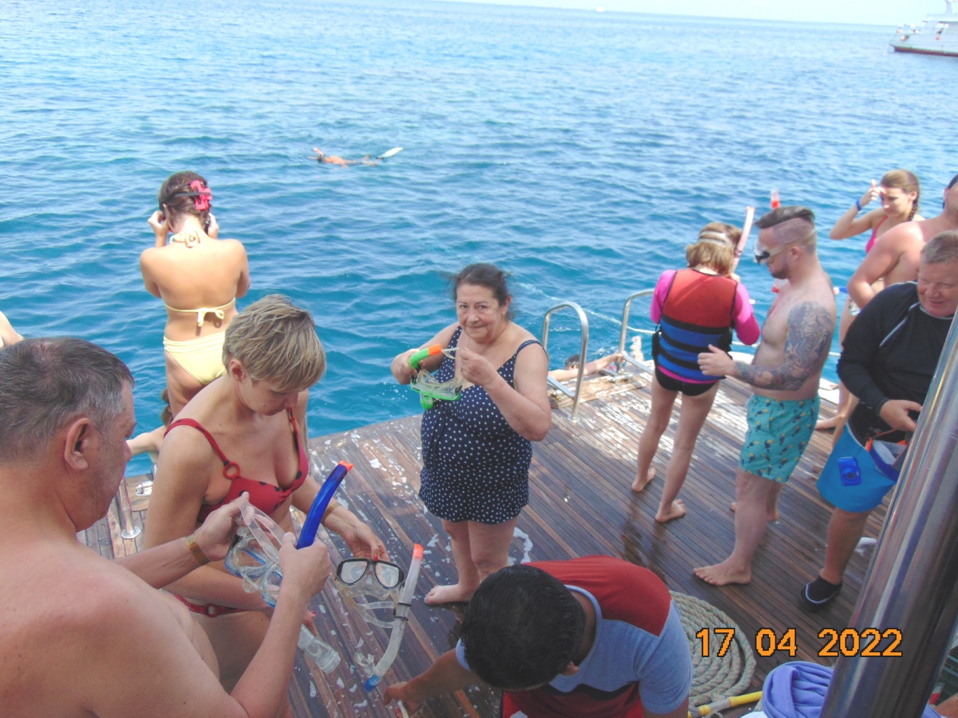 В 12.45 сме отново на кораба за да обядваме. Едновремено с това се отправяме към зоната на риф, където ще се гмуркаме. Влизането в морето става от задната палуба на корабчето. Снаряжават ни с плавници и маска и ни пускат да влизаме. Пред мен е Тамарка, от седнало положение скача във водата, малко несръчно и за тово попада леко под кораба. Тъкмо се притеснявам и тя успешно изплава. Скачам и аз.