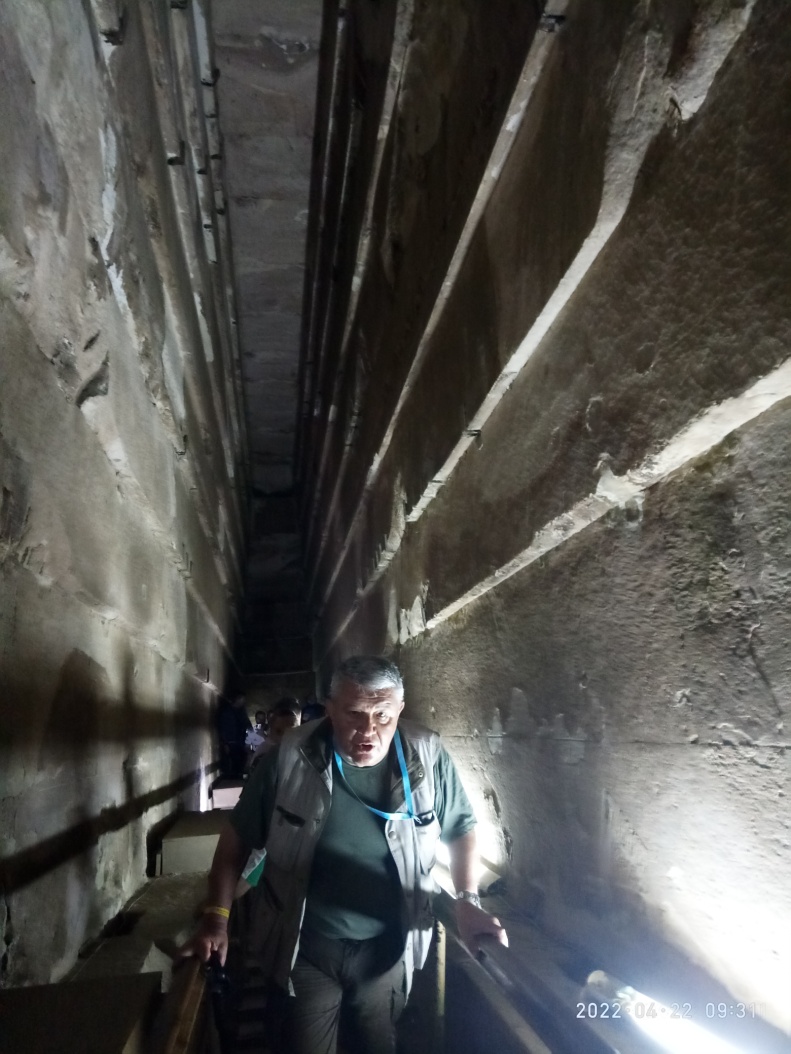 После започва трудното. Галерията става с широчина около1.4м и височина около метър. Така е в продължене на около 80м. и е трябало да бъде зяпълнена с каменни блокове които да се спуснат по нея, след полагането на фараона и по този начин да запечатат гробната камера. Не можах да попитам къде са тези каменни плочи и дали изобщо ги е имало. Ако ги е нямало е почти сигурно,че е нямало и погребение. Имало ли ги е, нямало ли ги е, ама сега трябва да мина през тази галерия за да допълзя до гробната камера.