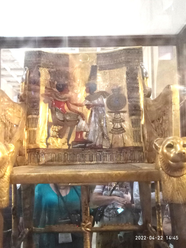 Естествено, най- интересна, е залата на Тутанкамон. За съжаление там снимането е забранено. Експонатите са впечатляващи. От световно известната му маска, през позлатените саркофази и стоманения нож, направен от метеоритно желязо (тогава е все още бронзова епоха). Впечатление правят и дребни детайли от бита, като презервативи например. Залата не е достатъчно голяма и за това част от експонатите са извън нея и можем да снимаме трона на фараона, за съжаление снимката не е достатъчно добра.
