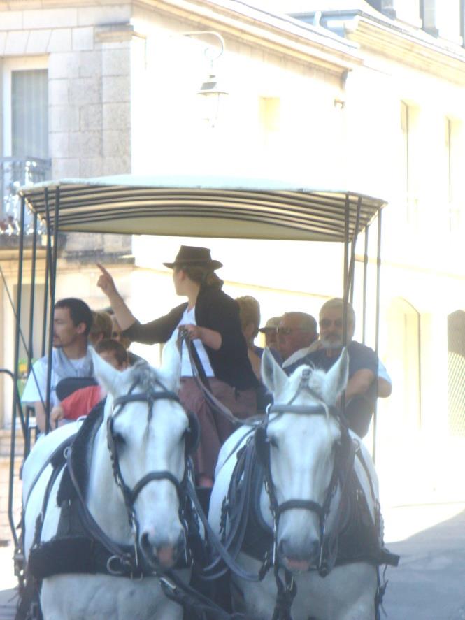 Движейки се по една тясна уличка се разминаваме с атракционна каруца и влизаме в замъка. Просторен двор,от три страни затворен със сгради, от четвъртата страна има църква и отваряне към река Лоара.