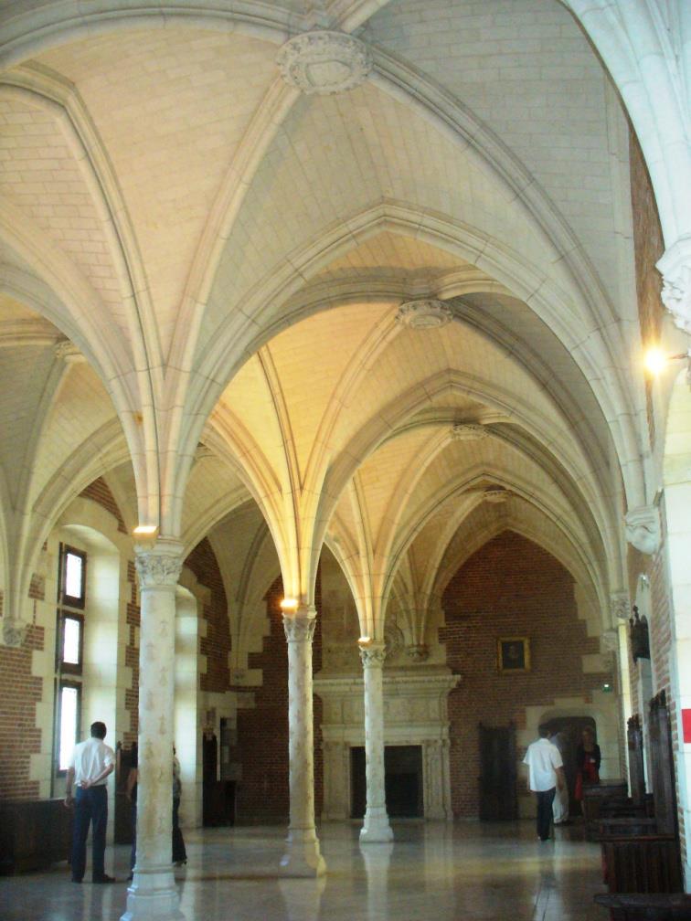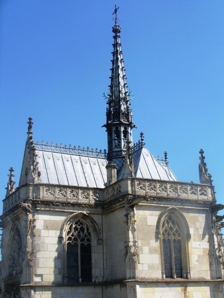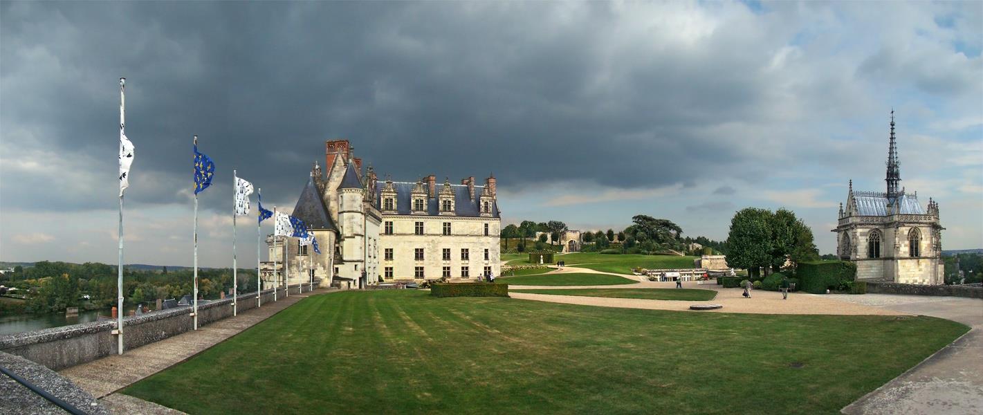 Вляво се вижда кралския дворец, парапетът до него е остатък от разрушените сгради на замъка. Отдясно е параклисът Св Юбер, той е покровител на лова, а в него е гробът на Леонардо да Винчи. Строен е в края на петнадесети век и първоначално е бил предназначен за гробница на Ан Бретанска.