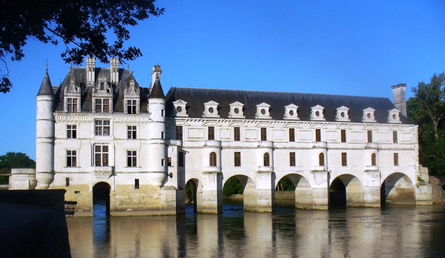 Концепцията на този оригинален замък е на една дама Катерин Брисоне, важна персона в двора на Шарл осми. Тя строи замъка в периода около 1513г., после тай е подарен на Диан дьо Поатие от любовника и крал Хенри втори. После е разширен от Мария Медичи, която изгражда галерията над реката. След това е обитаван от „бялата кралица” Луиз дьо Лорен – съпруга на убити Хенри трети. Бяла е, защото след смъртта на съпруга си през 1589г до края на живота си носи само бели рокли – тогавашния траурен цвят. Тя е на снимката.