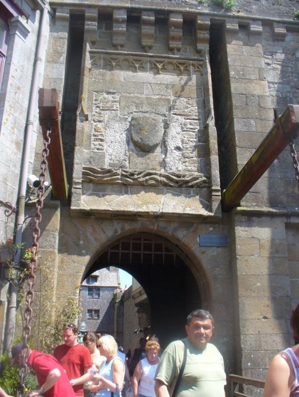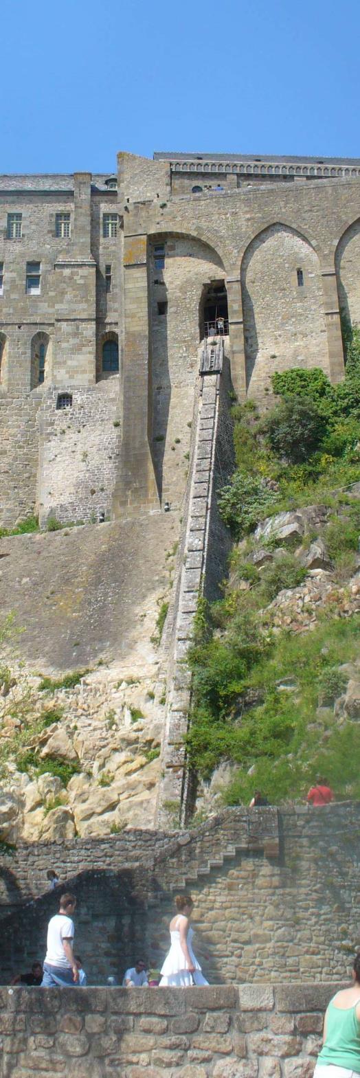 През 1204г., по времето на Филип Август абатството отново става френско и са изградени съществуващите сега укрепления. Май отново ще се отклоня за да обясня как се строи на такъв връх, как се качват материалите дотам. Ами просто, те са си на място. Строи се с наличната скала, като се подравнява най- горната част.Транспорт към пристанището е имало, това е една стръмна рампа (на съседната снимка), по която, с въжета товарите се изтегляли нагоре.