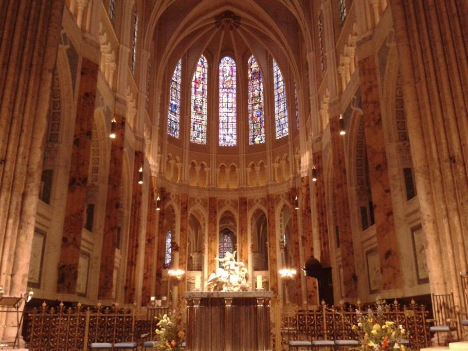 Интериорът напълно съответства на пламтящата готика отвън. Витражите са невероятни. Многобройни склуптури и мозайки , дърворезби и метални пластики създават усещане за спокойствие и великолепие.