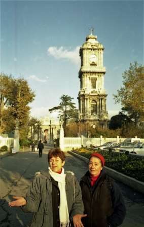 В кафето Нана си поръчва кока – кола, главно заради вървящия с нея лед, който схрусква с удоволствие. Качваме се на рейса и пътьом минаваме покрай входа на бароковия дворец Долма бахче. Не ни е в програмата и само снимам дамите пред кулата на южния вход.