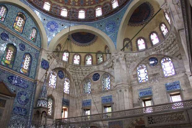 Както всяка голяма джамия и тя има красив двор, заобиколен от едноетажни сгради, в които е имало училище и приют. Джамията, както си му е редът има само едно минаре. С две и повече са само султанските. Всичко е изпипано и, някак с човешки размери, не като джамията на султан Ахмед. Почиваме си малко в двора, времето е хладно и не стоим дълго. Влизаме вътре и буквално ахваме.Не изглеждаща внушително от вън, вътре обемът е огромен и някак съвършен. Керамиката завършва усещането за обем и даже простор.