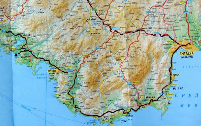 Та натоварихме се на рейса и се отправихме към курорта Tekirova. На картата местата на които преспивахме са отбелязани с Н.