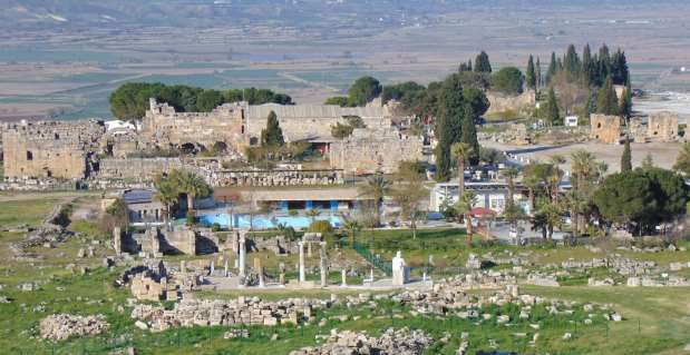 Вижда се храмът на Аполон и басейнът на Клеопатра, основния източник на вода за Памуккале.