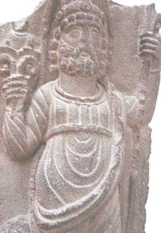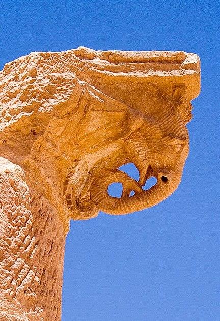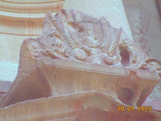 Скулптурата, увенчаваща фронтона, представлява слънчев диск, заобиколен от два рога и житни класове. Била повлияна от египетското изкуство. Фигурите на фасадата са силно увредени от времето, тъй като пясъчника е силно ерозирал.