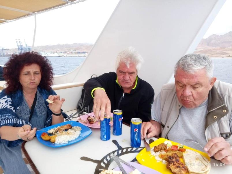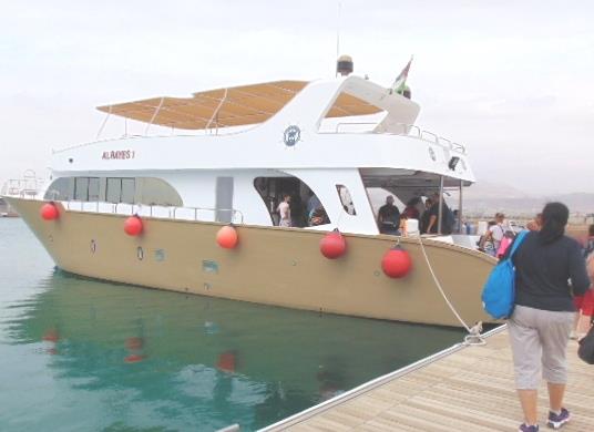 Тръгваме в 10.30ч – точно както е по програма. Корабчето ще ни заведе на около 20 км. на юг, срещу един от големите крайбрежни курорти където ще се погмуркаме малко в Червено море. Времето е леко хладно, има и вятър. Не е най- хубавото за мокрене.
