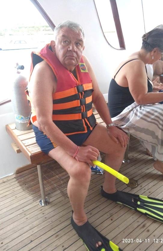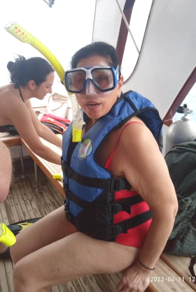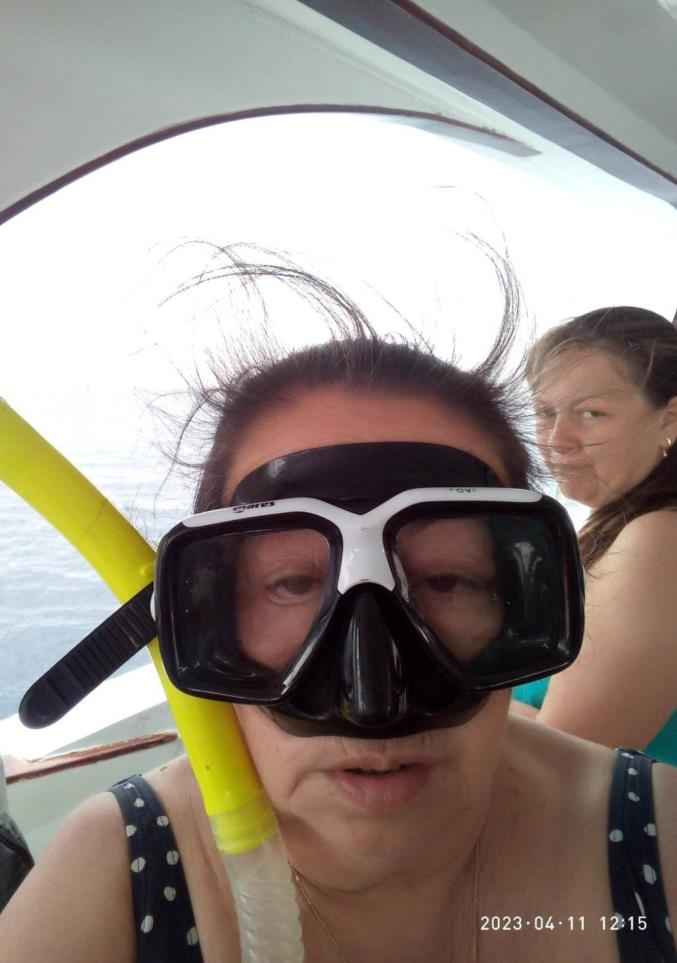 Следваме едно момче от екипажа, който ще ни води. При Тамарка се появява проблем. Жилетката и се измъква над главата й, действа като платно и й пречи да плува. Още повече,че е без плавници, не ги обича,с тях се давела.