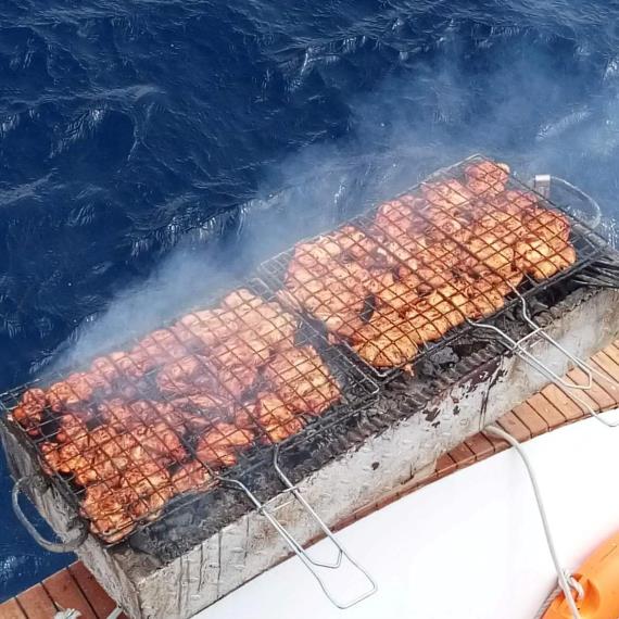За настроението допринася и носещият се аромат от скарата на която се пече обяда ни. Тя е сложена на перилата на кораба на долната палуба.