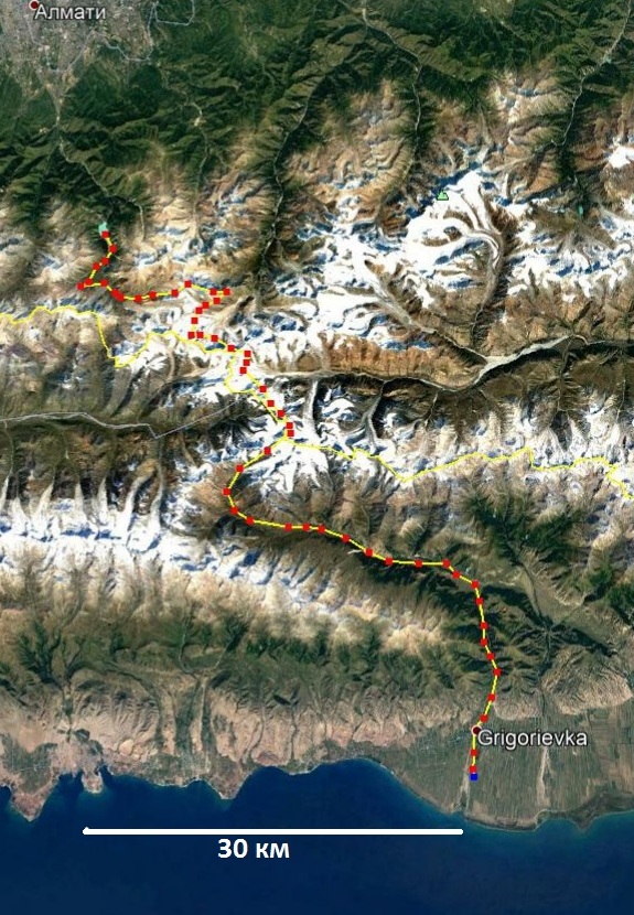 Напускаме ледника и след два часа много стръмно изкачване, около 16.30 ч. сме на превала – 4010м.н.в. Днес тук е раницата между Казахтан и Киризия. И ако преди малко гледката беше страшно красива и интересна, то тук тя е и величествена. Все пак, било е и има чудесна панорама. Хапваме набързо, правим малко снимки и тръгваме надолу.