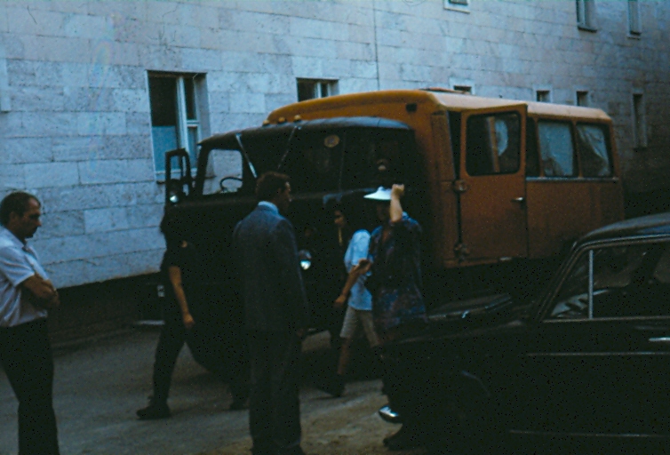 В най - добро разположение на духа посещаваме Интурист за да хапнем и поизмием преди нощното пътуване. Току пред хотела ставаме свидетели на пиянско сбиване, тъкмо си мислим, че няма как да не се извадят ножове и се оглеждаме накъде да изчезнем и се появява милиция. Милиционерите набързо натикват единия от биещите се на задната седалка на москвича, като междувременно му слагат белезници. С вторият нещата са по сложни. Много е як и се налага четири души да го закопчават с наръчниците. През това време, натиканият в колата, успя някак си да отвори прозореца (очевидно вратата е била заключена) и в стил фолсбъри се измъкна през него. Естествено пада на глава върху асфалта, но това не го впечатлява и използвайки залисията се измъква. Заедно с белезниците.