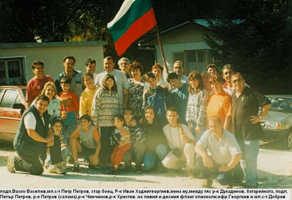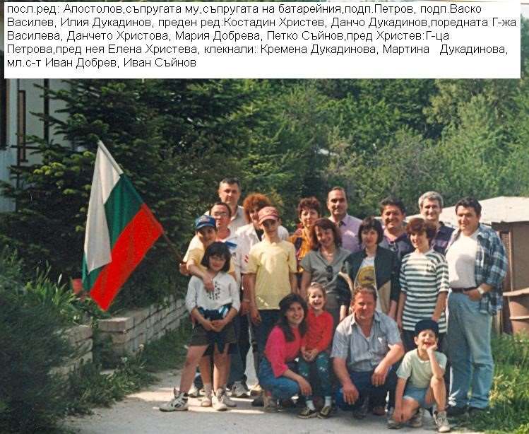Отляво, надясно: Господин и госпожа Петрови, пред тях, Мария Добрева, отзад мл.с-т Петров, следваме аз и Тамарка, зад нас Чинчинов, най отгоре Христев, пред него, съпругата на Чинчинов, зад нея Добрев, съпругата на Петров, Хаджигеоргиев, съпругата му, Дукадинов и подп. Василев – бате Васко. Снимката прави Кремена Дукадинова.