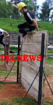 Следва дървена стена висока два метра, трябва да се засилиш и да я преодолееш. Тук много хора имаха затруднения, цинтарките се плъзгаха по дъските, а и никога не съм бил добър на скоковете. За решаване на проблема, при проверки, някъде на височина около метър се поставяше един клин, само главата му се показваше над дъските и почти не се забелязваше. Тази глава обаче, даваше за секунда опора на обувката и боецът с лекота пехвърляше стената. Снимката е от пожарникарско състезание, но дава добра представа за препятствието.