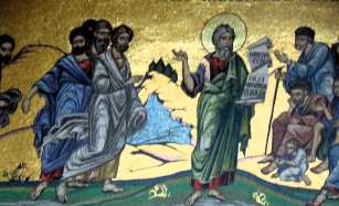Първото което виждаме е камбанарията, вградена в стената на обителта. Под стряхата са изобразени дванадесетте апостола, по четирима от всяка страна. Мозайките са красиви, а надписите на български.
