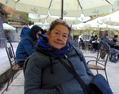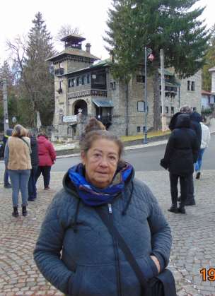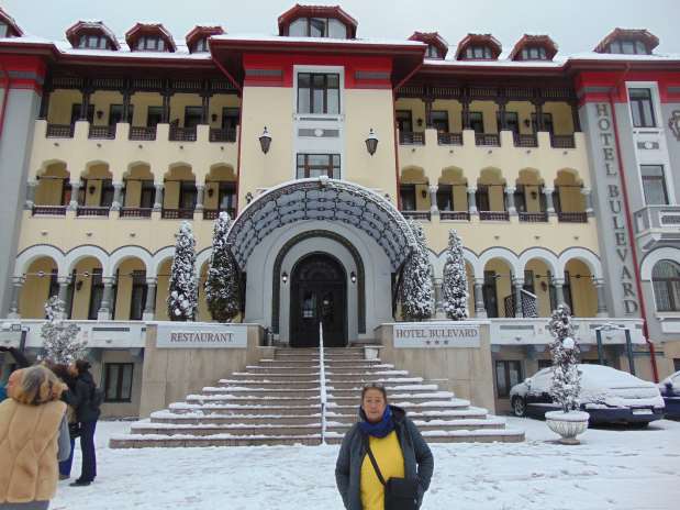 На другата сутрин – 19 ноември 2023г. пак има великолепна закуска и пак в девет часа тръгваме на път. Вече е натрупало малко сняг и правя прощална снимка на Тамарка пред хотела.