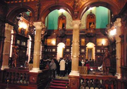 След чакането влизаме в двореца и по парадната стълба попадаме в голямата зала. Това не е тронната зала, а мястото за приеми. Изящно изработеното дърво преобладава. Залата преминава през три етажа и има разкошен стъклен покрив, който може да се отваря. Първоначално с въртене на макари, а след това, с електричество.